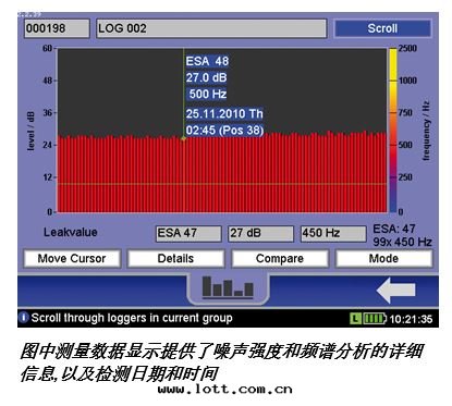 歸功于獨有(yǒu)的(de)頻譜分(fēn)析功能(néng),SebalogN-3記(jì)录(lù)器同(tóng)时(shí)測量(liàng)漏水(shuǐ)噪声 強(qiáng)度(dù)(db)和(hé)頻譜,噪声強(qiáng)度(dù)較高(gāo)通(tòng)常表(biǎo)示有(yǒu)漏點(diǎn)産生(shēng),但是(shì)只(zhī)有(yǒu)綜合噪声強(qiáng)度(dù)和(hé)頻譜分(fēn)析才有(yǒu)助于識别漏點(diǎn)到(dào)探头(tóu)的(de)大(dà)概距離.操作(zuò)者(zhě)